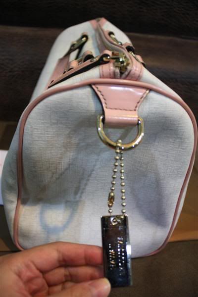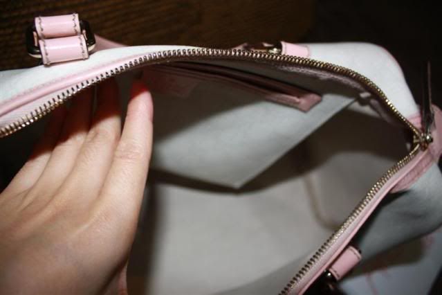 กระเป๋าสีขาว-ชมพูอ่อนหวานสวยงามมากค่ะ โดยรวมสภาพแทบจะไม่มีที่ติ แต่มีรอยเลอะด้านนอกนิดเดียว ส่วนภายในนี่ใหม่กริ๊บมาก ซื้อมาจากช็อปเองเลยค่ะ