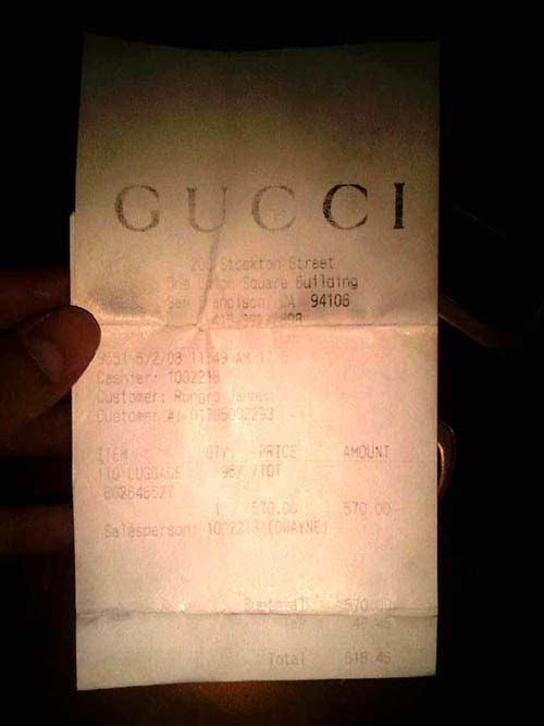 ใบเสร็จ (หมึกจางไปเยอะแล้วคะ แต่ยังมีตัวเลขการซื้อ สถานที่ซื้อ และชื่อให้เห็นอยู่นะคะเราซื้อเองจาก Shop ที่ Shop : San Francisco,US เมื่อวันที่ 2/06/2008 )