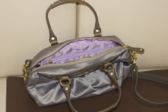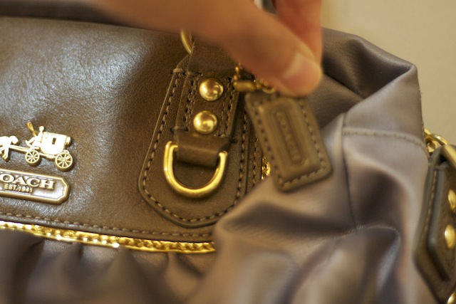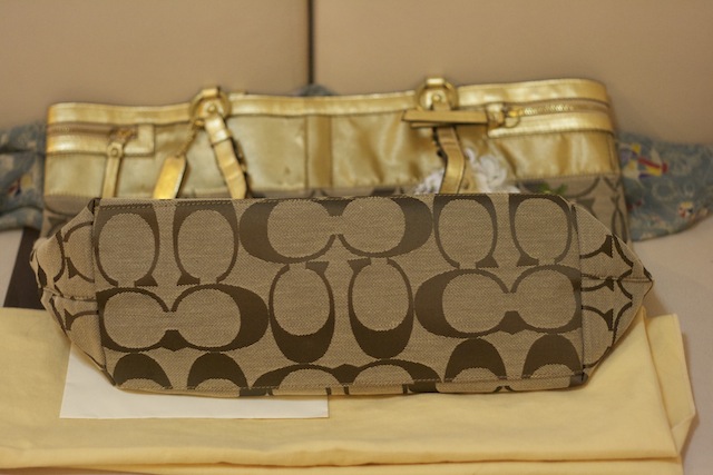 Coach (Store Display) สะพายข้าง ห่วงทองเป็นรอยนิดหน่อย สภาพดี ไม่เคยใช้ ผ้ากระเป๋าสีเงินข้างในม่วงทอง ไม่มีแคร์การ์ด หูหิ้วกับสายสะพายเป็นหนังหมุดทอง