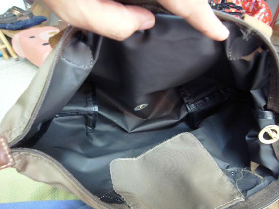 10. กระเป๋า longchamp ไซส์ "s" หูยาว สีเบจ ดึงแยกซับออกเป็นสองชั้นแล้วค่ะ มีขาดด้านในตามรอยเย็บติดกับสายหนังค่ะ ขาย 650 รวมส่ง