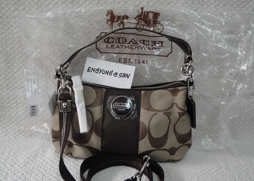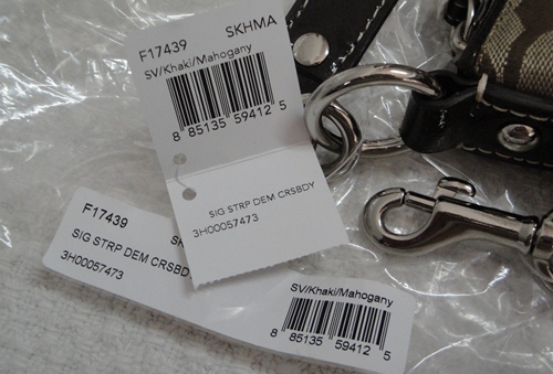 4. COACH - 17439 Signature Stripe Cross Body Bag สี กากี/น้ำตาล (Khaki/Mahogany) ขนาด 11*7*4 นิ้ว กระเป๋ารุ่นนี้เป็นที่รู้จักกันดีไม่ต้องบรรยายสรรพคุณ ใช้ได้ 2 แบบ ทั้งถือ/คล้องแขน หรือจะสะพาย (มีสายยาวมาด้วย) อุปกรณ์มี น้องเป๋า /Care Card /Receipt (Copy) และ Plastic Bag จาก Coach ราคาพิเศษ 4,390 บาท