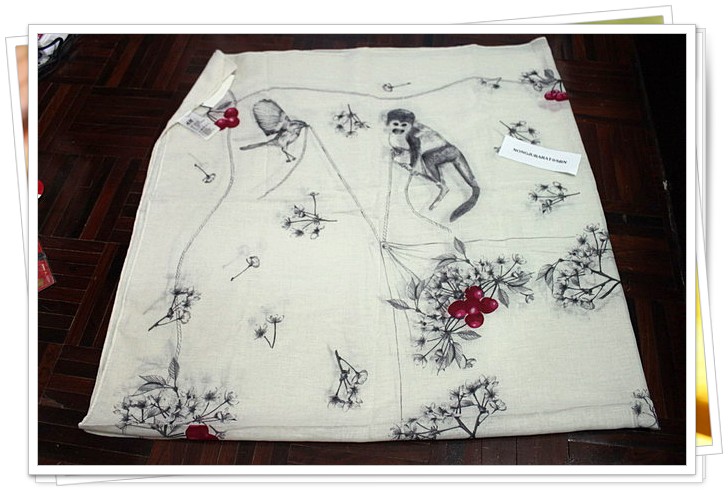 ผ้าพันคอผืนสีครีม ลายลิง นก และลูกเชอร์รี่ เป็นผ้า cotton 100% ขนาดใหญ่ คุ้มมากเลยผืนนี้