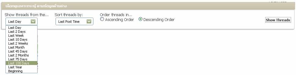 1. ให้เลือก Show threads from the... เป็น Last 100 Days หรือ Beginning (เป็นการแสดงจากวันตั้งกระทู้)