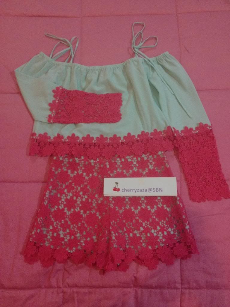 น่ารักมากๆค่ะ ลูกไม้สวยมาก เสื้อเป็นยางยืดเปิดบ่าผูกโบว์นะคะ ถ้า xs จะลอยค่ะ s กำลังน่ารัก เอวกางเกง 26 นิ้ว สะโพก 36 นะคะไม่มีตำหนิทั้งเซทราคาเต็มสี่พันกว่า ขาย SOLD ค่ะ ไซส์เล็กไม่เหลือถึงเซลล์นะคะ ซื้อมาราคเต็มค่ะ รวมส่งอีเอมเอสค่ะ ลูกไม้สีชมพูกุหลาบนะคะ น่ารักสุด ๆค่ะ