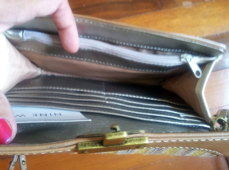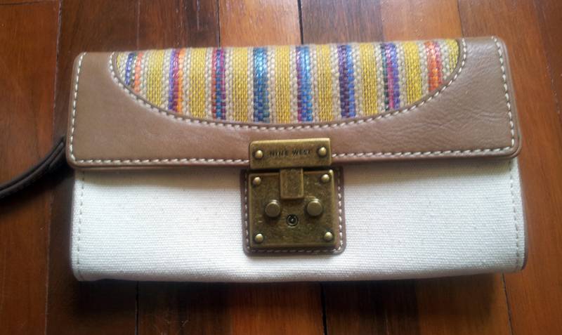 1. กระเป๋าสตางค์ Nine west จากอเมริกา ตัวกระเป๋าเป็นผ้าซักได้นะคะ ฝาปิดเป็นหนังแท้ ลายสวยค่ะ ขนาดกว้าง 8 นิ้ว สุง 4 นิ้ว
