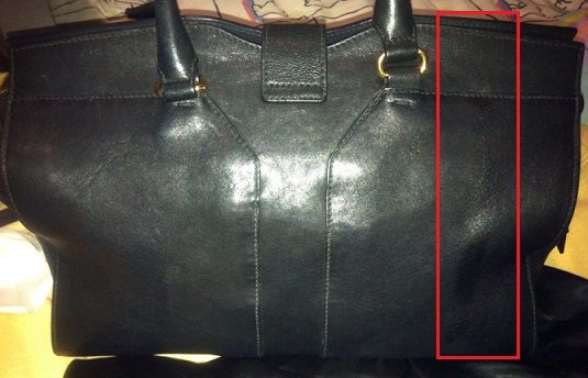 เคลือบหนังที่ bag spa เรียบร้อยคะ.. แต่มีตำหนิรอยน้ำที่ด้านหลังกระเป๋าตามภาพที่วงสีแดงคะ ถ้าไม่ใช้แฟลชมองแทบไม่เห็นเลยคะ