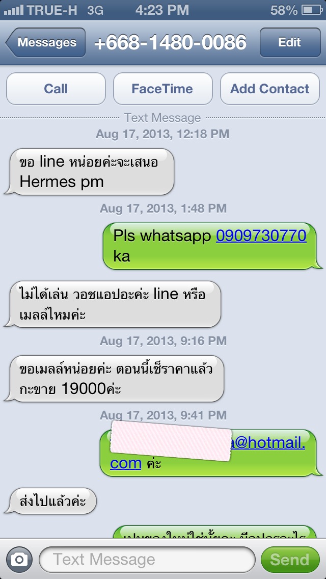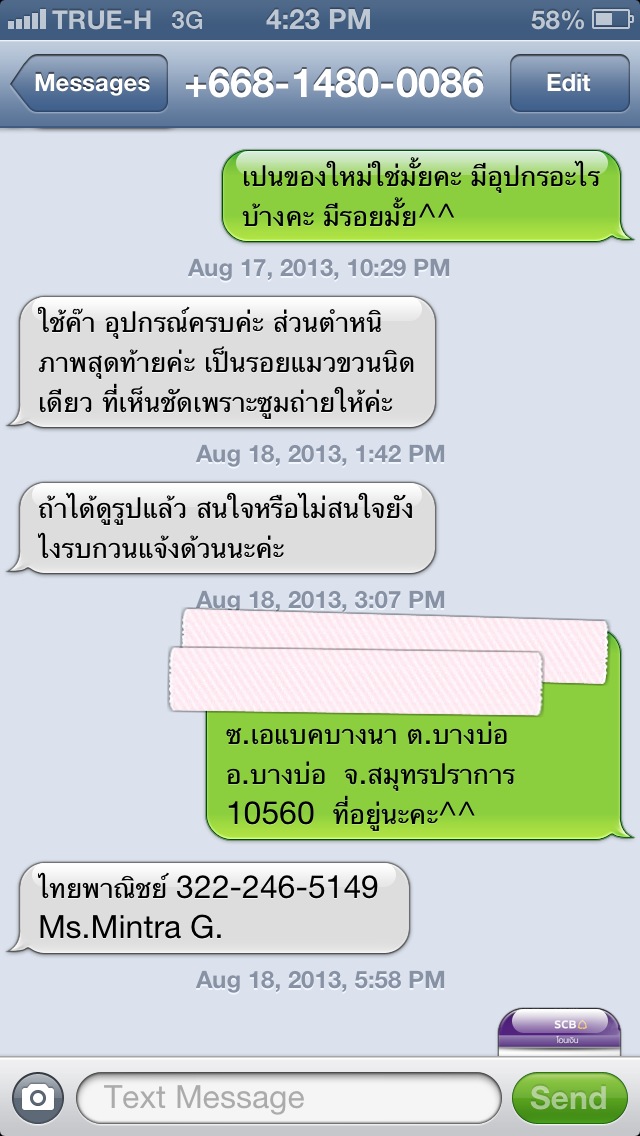 เค้ามาเสนอขายเรา และส่งรูปให้ทางอีเมล โดยในรูปมีป้าย userใน sbn ด้วย ก่อนเราโอนเงินเค้าจะโทรมาตลอด(ถามว่าได้รับรูปรึยังคะ ,ยังสนใจมั้ยคะ) เป็นเวลา2วัน แล้วเมื่อวานเราตกลงโอนเงินให้ เค้าตกลงจะส่งของให้วันนี้ก่อน10โมงแล้วจะมาแจ้งเลขtracking ตามปกติที่ แต่วันนี้พอเราโทรไปเพื่อจะขอเลขtracking ตั้งแต่เช้าจนถึงตอนนี้ เป็นไม่มีสัญญาณตอบรับจากหมายเลขที่เรียก คือดึงซิมส์ออกแล้ว (เราเริ่มเอะใจตอนแรกว่าจะรอให้ผ่านไปก่อนเผื่อเค้าแบตหมดหรือมีธุระเค้าอาจจะส่งของแล้วจริงๆ) แต่พอเราลองเอาชื่อ มินตรา กูดคล้ายมาเสริชgoogle ชอคคะ รายชื่อมิจฉาชีพขึ้นเต็มเลย
