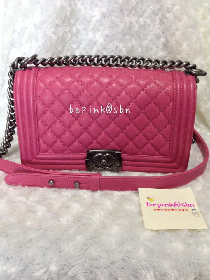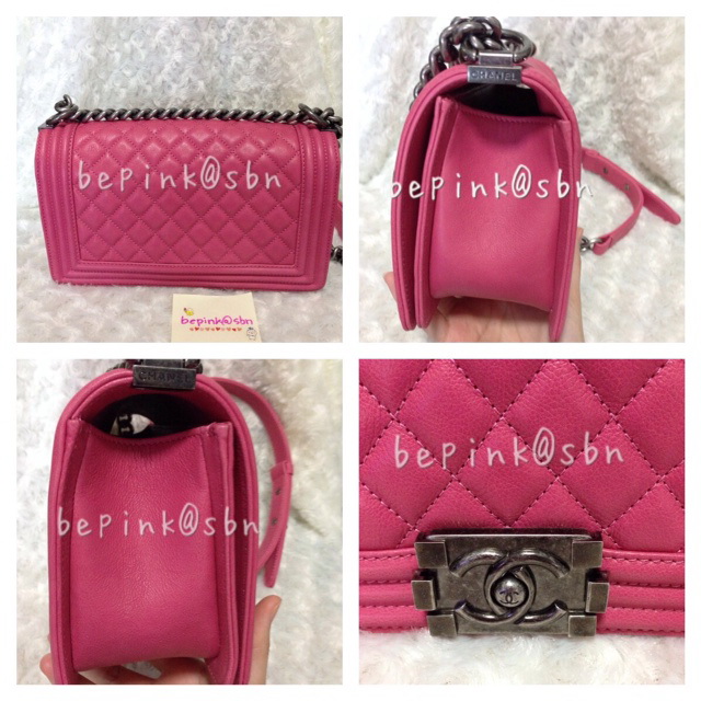 new chanel boy 10" pink calfskin สีชมพุสวยหวานสดใสมาก เป็นหนังcalfskinซึ่งทนกว่าหนังlamskin แต่ความสวยไม่แพ้หนังแกะเลยคะ สะพายสายเดี่ยวสายคู่ได้หมด หายากคะไม่ค่อยมีคนปล่อย รับไปรับรองไม่ผิดหวังแน่นอน ขอรูปเพิ่มเติมทางไลน์ได้คะ ราคา 133,500 บาท ลดเหลือ 129,500 บาท