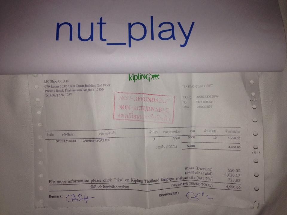 วันที่ซื้อมา ซื้อจากshop kipling ที่ siam center วันที่ 21/09/2556