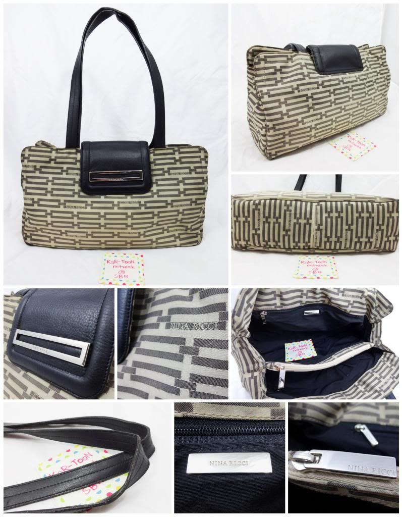 (Used) Nina Ricci สภาพ 80% วัสดุทำด้วยผ้า ตกแต่งดัวยหนัง มีร่องรอยผ่านการใชังานมาบัาง แต่ไม่ชัดเจน ภายในสะอาดดีมาก อะไหล่เงินเงาวิ๊ง กระเป๋าใบใหญ่ จุของได้เยอะ หูกระเป๋ามีรอยถลอกบ้างตามสภาพมือสอง ขนาดกระเป๋า 36x30xx10 เซ็นติเมตร