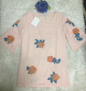 เสื้อผ้าพริ้วสีชมพูปักดอกไม้จาก ouremu size M ของใหม่แขนบานนิดๆ
