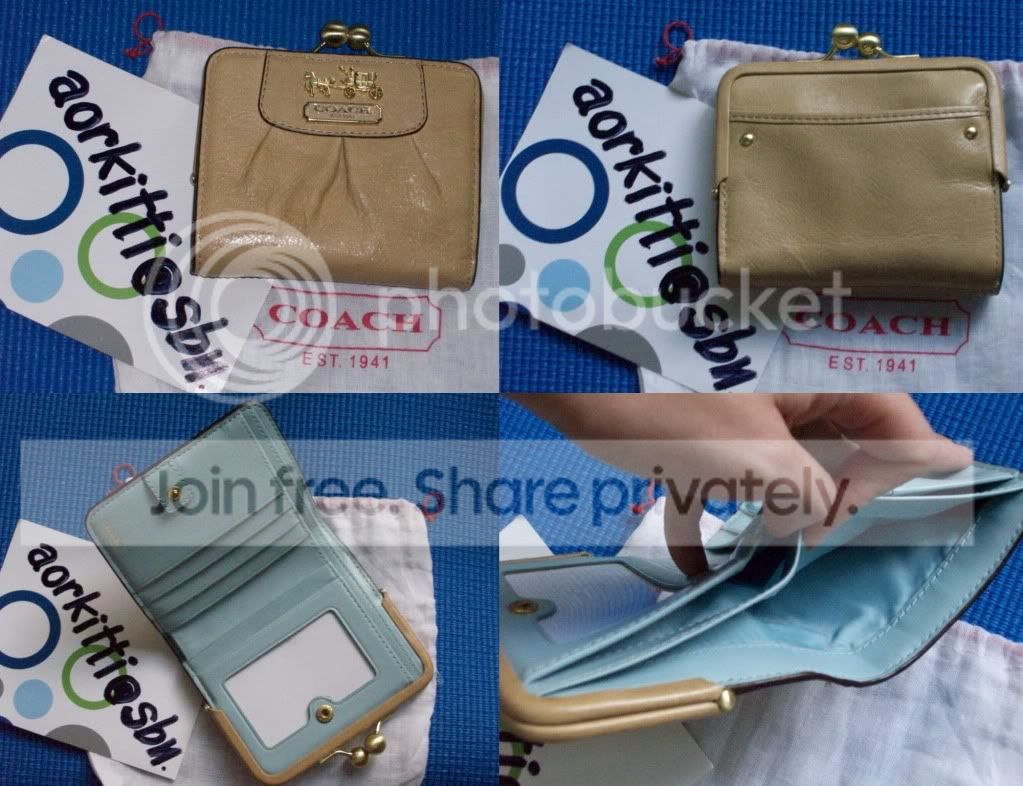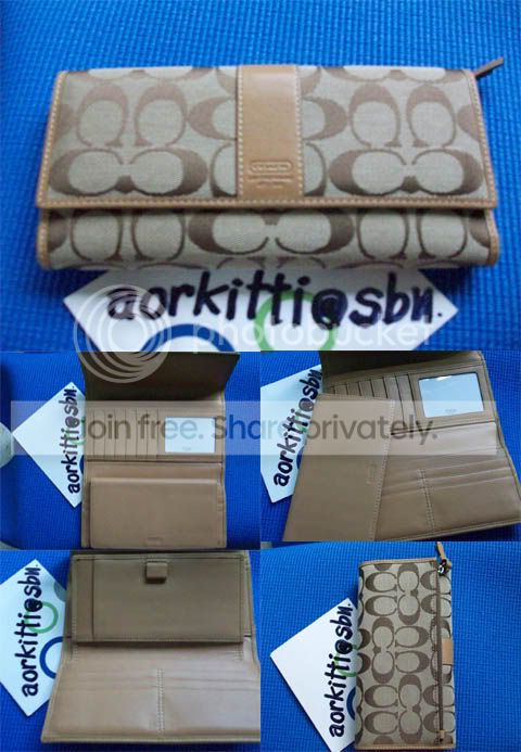 กระเป๋าตังCoach แบบสั้นประมาณ 4.5”x3.5” สีน้ำตาลอ่อน มีช่องใส่บัตร 6 ช่อง ช่องใส่เหรียญ ช่องใส่แบงค์ วัสดุเป็นหนัง 3,750 บาท