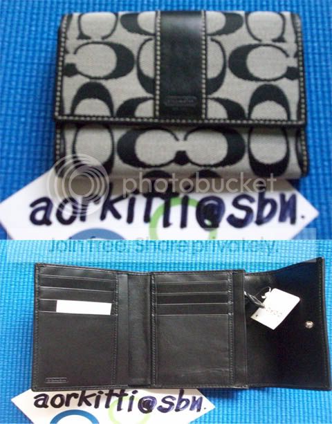 กระเป๋าตังCoach แบบสั้นประมาณ 4”x5.5” มีช่องใส่บัตร 8 ช่อง ช่องซิบใส่เหรียญ ช่องใส่แบงค์ ลายกราฟฟิกCoach ดำ วัสดุเป็นผ้า และหนัง ขาย 3,600 บาท