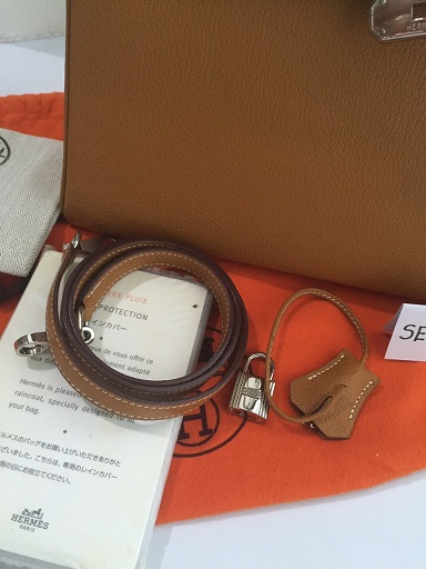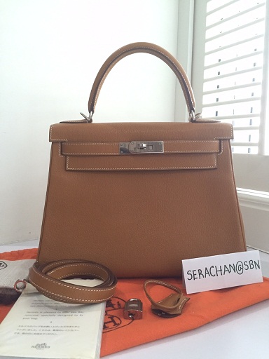 Used in good condition Hermes Kelly 28 Natural Sable PHW Chevre stampe Iอุปกรณ์ ถุงผ้า แม่กุญแจ Raincoat (ไม่มีกล่อง) ราคา 305,000 บาท