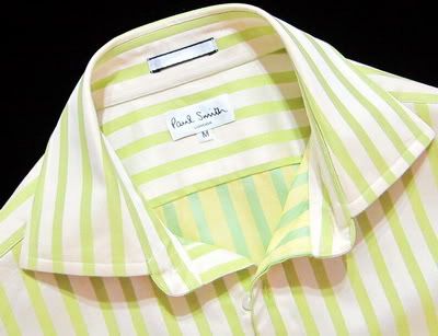เสื้อเชิ้ต Paul Smith Size : M ลายทางสีครีมสลับเขียว ผ้าเงาๆ บ่าหลังทอลายทแยงขึ้น ข้อมือแบบ Double Cuffs ซ่อนลายเอาไว้ (ไม่แถม Cuff links) สวยหรูสุดๆครับ