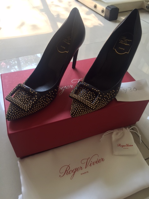 NEW:: รองเท้า Roger Vivier สีดำตกแต่งหมุดทอง ไซส์ 36 สวยหรู ดูดี ราคาเต็มใกล้ๆสามหมื่น ขายเพียง 15,500 บาท อุปกรณ์ตามภาพเลยค่ะ (กล่อง ถุงใส่รองเท้า ส้นสำรอง ใบเสร็จ) ใหม่เอี่ยมนะคะ