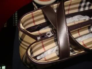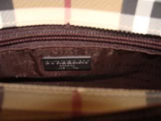 อีกใบเป็น ยี่ห้อ Burberry คะเป็นแบรนด์ของอังกฤษแต่ในนี้ Made in Italy คะ รุ่นอะไรไม่ทราบคะ ตัวกระเป๋าเป็น PVC แข็ง นะ แต่ถือตูแล้วไม่หนักนะคะ มีช่องใส่ของสามช่องด้วยกันคะ มีซิปใส่ของเฉพาะช่องตรงกลางคะ ใบนี้เก่าเก็บนิดนึง มีรอยสีน้ำเงินจางๆ ตรงด้านหน้า แต่ถ้าไม่สังเกตจะไม่เห็นนะคะ คาดว่าเกิดจาก สีของ ถุงกันฝุ่นจะซึมลงไป ไม่แน่ใจเหมือนกันคะ เพราะเก็บอย่างเดียว ตัวกระเป๋า เป็นสีเบจ เหลืองทอง น้ำตาล สลับกันเป็นลายตารางของ signature ของ Burberry คะ แต่งขอบและหูหิ้วเป็นหนังสีน้ำตาล หูหิ้วก็ยังใหม่เหมือนเดิม ไม่แตก ไม่ลอก ไม่ดำ ใบนี้ขนาดอยู่ที่ หน้ากว้าง 13” x ส่วนฐาน 4 x สูง 7.5”