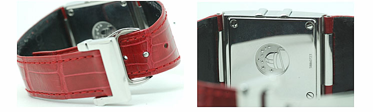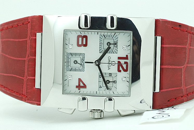 14) Omega - Quadra - Chronograph จับเวลา เลดี้ หน้าปัดเหลี่ยมมุกขาว ตัวเลขแดง เพชรใน 4เม็ด หน้า สายหนังสีแดง (Female : ผู้หญิง)