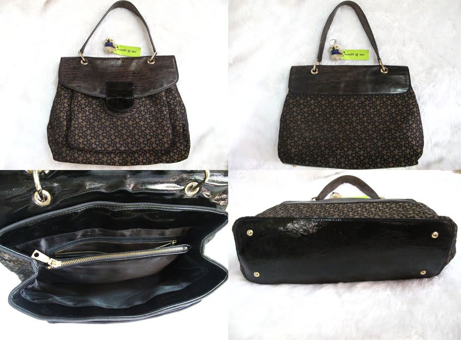 DKNY สวยๆค่ะ แจ่มมากๆใบนี้ ด้านในเหมือนใหม่ ให้ 90% เลยจ้า ตัวกระเป๋าเป็นผ้าทอลาย ฝากระเป๋าเป็นหนังปั๊มลายค่ะ ส่วนก้นกระเป๋าเป็นหนังแกว้สีดำ ได้ 3 อารมณ์เลยค่ะ ขนาด กว้าง 14 นิ้ว สูง 13 นิ้ว ก้นกระเป๋าหนา 5 นิ้วค่ะ ราคา 2000 บาทเท่านั้นค่ะ