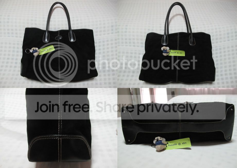 TOD'S ตัวกระเป๋าเป็นผ้าสักราดสีดำเข้ม ไม่มีเฟด หูกับมุมเป็นหนังเก๋มากๆ ใบใหญ่ จุค่ะ ขนาด ปากกระเป๋า 17 นิ้ว สูง 11 นิ้ว ก้นกระเป๋ากว้าง 5.5 นิ้วค่ะ ราคา 5500 บาทค่ะ