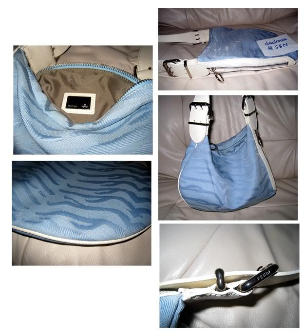 + Fendi กระเป๋าผ้าลายม้าลายสีฟ้า หนังขาว สภาพดี ซื้อจากเกษรค่ะ SOLD (Thk K. Orn naka)