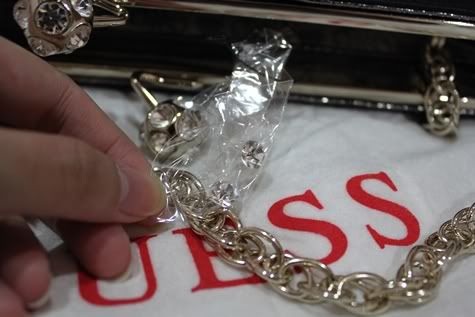 มีเพชรสำรองให้อีก 2 เม็ดคะ ต่อด้วยกระเป๋า Guess สุดเก๋... รับรองไม่ซ้ำใครแน่นอนคะ ขนาด 12x 9 นิ้ว สายยาว 23 นิ้ว แต่ใบนี้มีรอยเลอะเล็กๆ น้อยๆ หลายจุด มีด้ายรันเปนบางจุด แต่สภาพโดยรวมโอเคเลยคะ หิ้วไปก้อยังน่ารักมากๆ ให้ 70% อ่ะคะ ด้านในเปนสีชมพูออกส้มตามรูปคะ... สะพายได้ 2 แบบตามรูปนะคะ ใบนี้ปล่อยไปถูกๆ ที่ 1500>>1200 เลยคะ มีถุงผ้าให้นะคะ (แต่แอบยับหน่อยเพราะเก็บไว้ในตู้คะ)