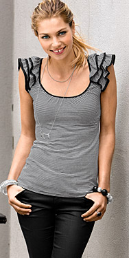 เสื้อแขนสั้น ลายขวางเล็กๆ ของ H&M ไซด์ xs ตรงช่วงแขนทำระบายเป็นชั้นๆ มี 2 สี ค่ะ (สีแดง กับ ดำ ) ขอขายตัวละ 420 บาทคะ