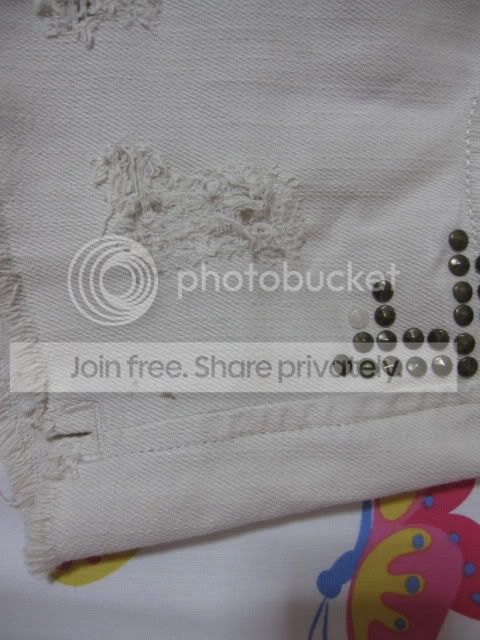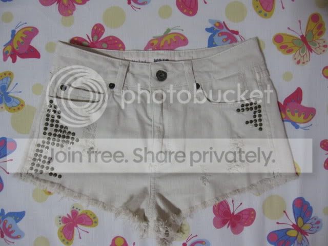 กางเกง Topshop moto hotpants size UK6 ตอกหมุดสีขาวควันบุหรี่ มีตำหนิเป็นรอยดำๆตรงขอบกางเกงนิดเดียวค่ะ ขาย 500 บาท