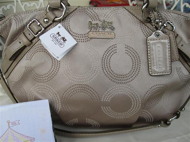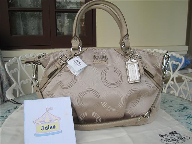 Coach madison op art sabrina khaki/brass 12947 ขนาด 12*7*5 นิ้ว ใบนี้เป็นของใหม่ แต่มีตำหนิที่ส่วนหนังด้านหลัง เป็นรอยขีดจางๆยาวประมาณ 2 ซม. 2 จุด ตามรูปค่ะ ขายลดราคาที่ 7900 ค่ะ มีถุงผ้านะคะ มีแคร์การ์ดค่ะ