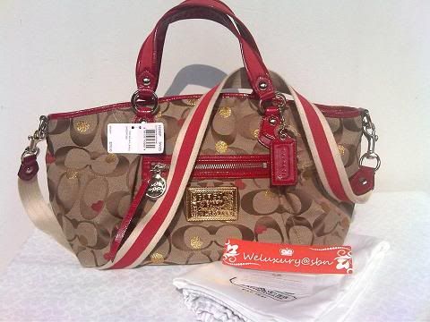 1. Coach Poppy Signature Sateen Lurex Rocker #16295P ขนาด12.5 (L) x 9.5 (H) x 5 (W) พื้นสีน้ำตาล ลาย C Signature แซมด้วยจุดสีทองและหัวใจเล็กๆสีแดง หุ้มขอบกระเป๋าและป้ายห้อย coach ด้วยหนังสีแดง น่ารักมากมายเลยค่ะใบนี้ สะพายได้หลายแบบค่ะ จะสะพายเฉียง สะพายข้าง คล้องแขน เก่ได้ทุกแบบค่ะ สายสะพายถอดออกได้นะคะ มาพร้อม ถุงผ้า, Original Price Tag, Coach Care Card, และ Coach Tissue Paper ค่ะ ---SOLD---