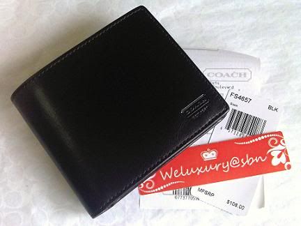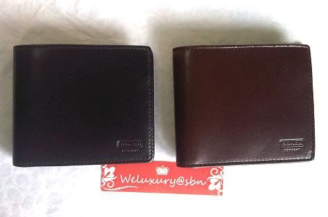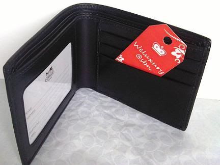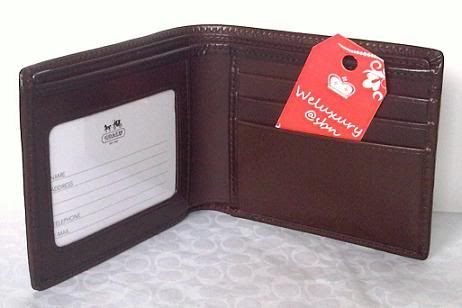 3. Coach Men's Double Fold ID Wallet # FS4657 ขนาด 4.5" (L) x 4" (H) กระเป๋าตังค์ผู้ชายเป็นหนังทั้งใบ ด้านในมี 2 ช่องยาวใส่แบงค์, 3 ช่องใส่บัตร, 1 ช่องหน้าต่างใสสำหรับใส่ ID Card, 2 ช่อง multi-purposeราคาใบละ 4,500 บาท มี 2 สีค่ะ สีดำ และ สีน้ำตาลเข้ม