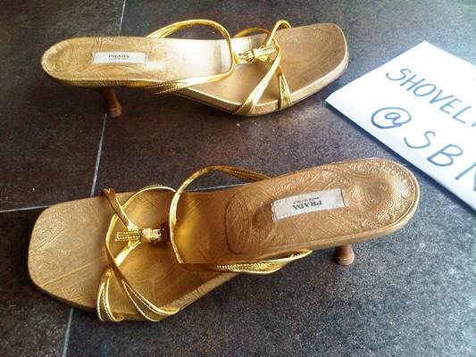 รองเท้า PRADA ส้นเตี้ย สายคาดสีทอง พื้นลายสีทอง Size 37 มีเฉพาะรองเท้า ขาย 2,900 บาท