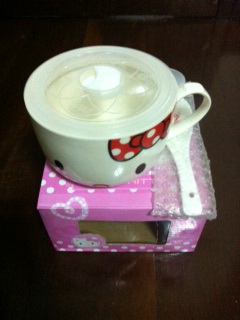 ถ้วยเซรามิค ลายหน้าคิดตี้ มีช้อนกับฝาครอบ เอาเข้าไมโครเวฟได้ค่ะ ขอขาย 450 บาทคะ