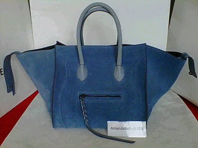 *** NEW *** Stunning and flawless CELINE PHANTOM LUGGAGE bag. This is the "IT" bag for fall that everyone is talking about and the wait list is a mile long! For a dramatic look, this bag can be left open with the winged sides & tassels or you can close the wings so it looks like the regular Celine luggage. Celine Phantom สี Blue Sky in Suede leather ( Pre-Fall/Winter Collection 2011 ) ใหม่ล่าสุด หนังทั้งใบ หนังหอม นิ่ม หายากกกกสุดๆ จริงๆค่ะ มาพร้อมถุงผ้า ถุงกระดาษ การ์ดต่างๆ และ สำเนาใบเสร็จค่ะ SOLD คุณนก