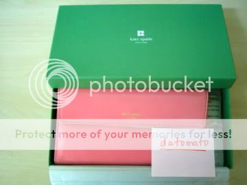 A. Kate Spade Cyril Continental Wallet w/ Checkbook กระเป๋าทรงยาว สีหวานแอบเปรี้ยว Katy Pink/Green ข้างนอกเป็นหนังสีชมพู ข้างในหนังสีเขียวโทนสีเฉพาะแบบ Kate Spade หนังด้านนอกออกแนวมันแบบ patent มีช่องใส่บัตรมากมาย และช่องใส่เหรียญตรงกลางขนาดใหญ่ มาพร้อมกล่องค่ะ ขนาดกระเป๋า 7.5x4.25 inches ราคา 8500 ลดแล้วค่ะ 7000 บาท ส่ง EMS ให้ฟรีค่ะ