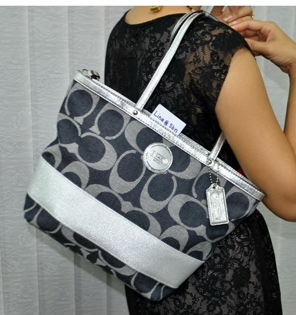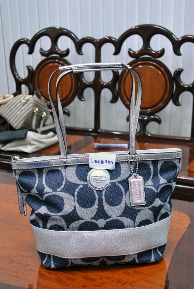 4.COACH 17433 รุ่นนี้เป็นรุ่นมาใหม่ค่ะ ตัวกระเป๋าทำจากผ้ายีนส์ สายหนังสีเงินแวววาว ขนาด 14x10x4 ราคา 5200