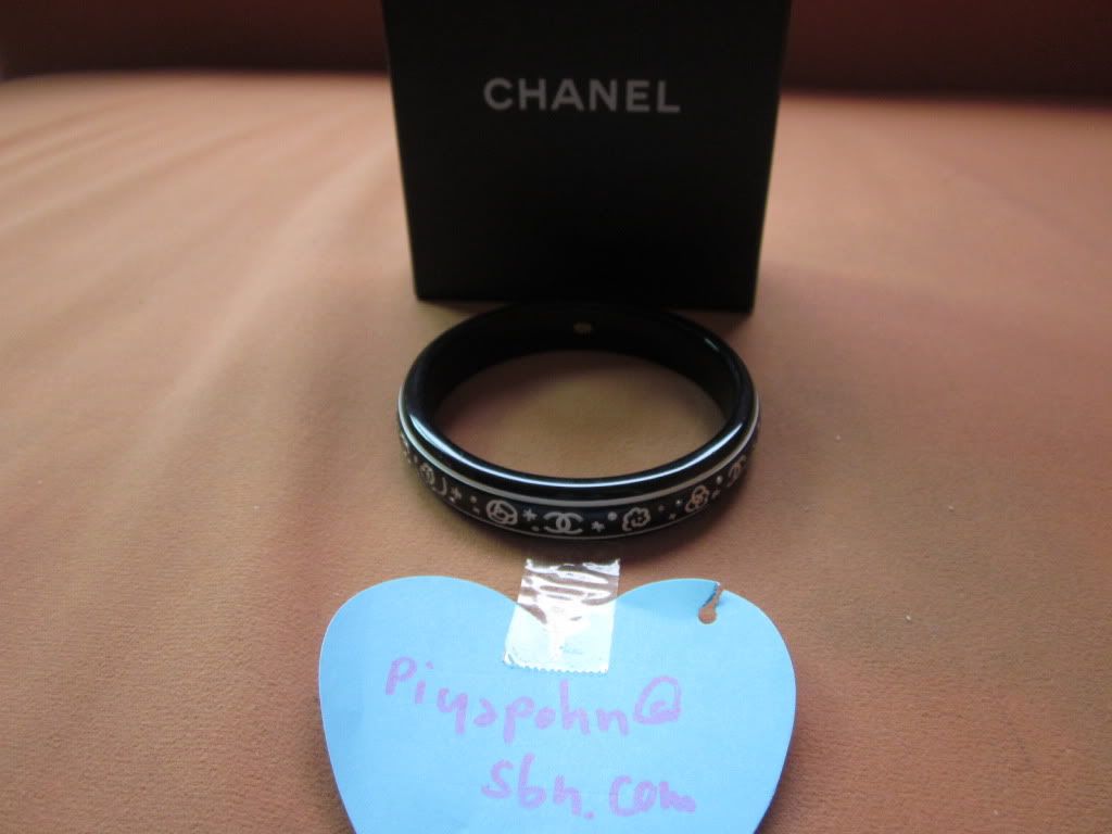 Chanel ลายดอกคาเมเลีย สีดำ รอบวง (วัดจากด้านนอก)ประมาณ 10 นิ้ว ความกว้างประมาณ 1.5 ซม. พร้อมกล่อง มีใบเสร็จ ขาย 9000