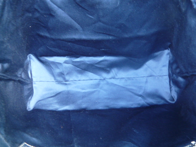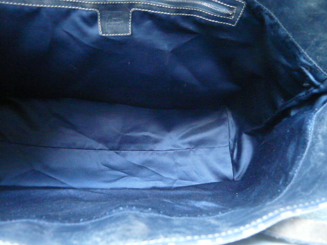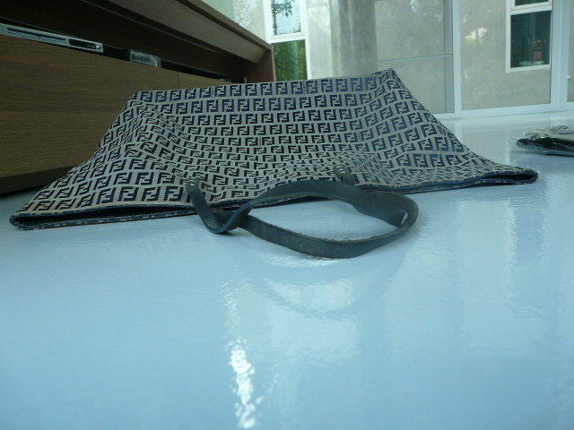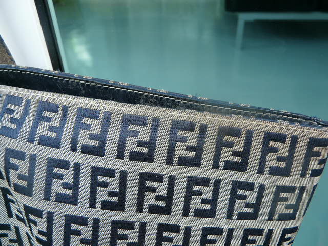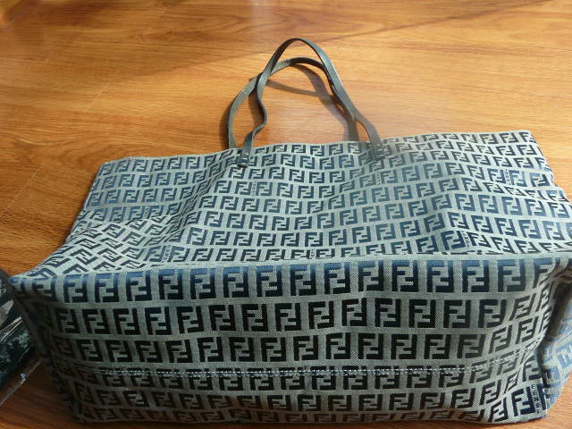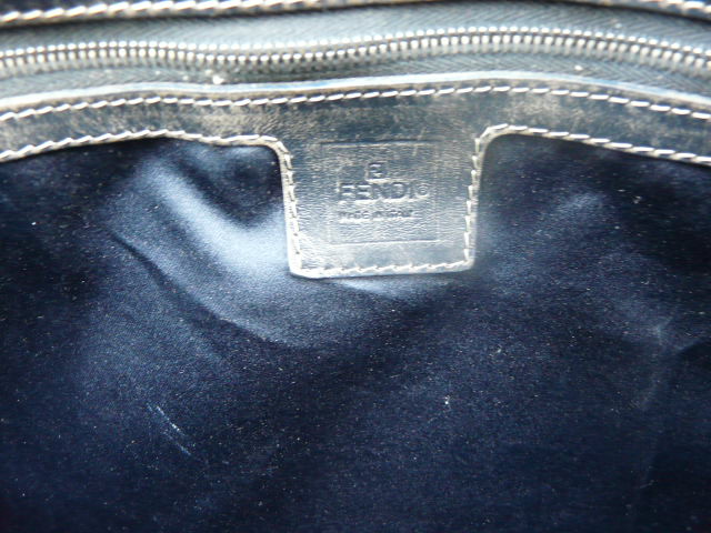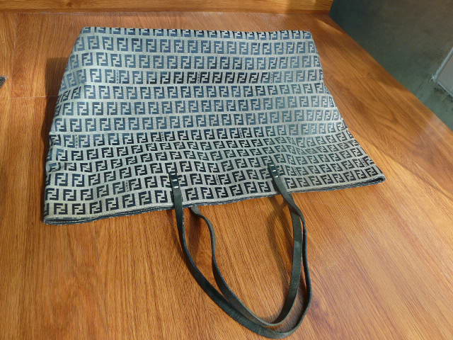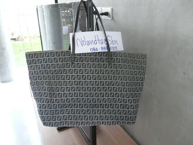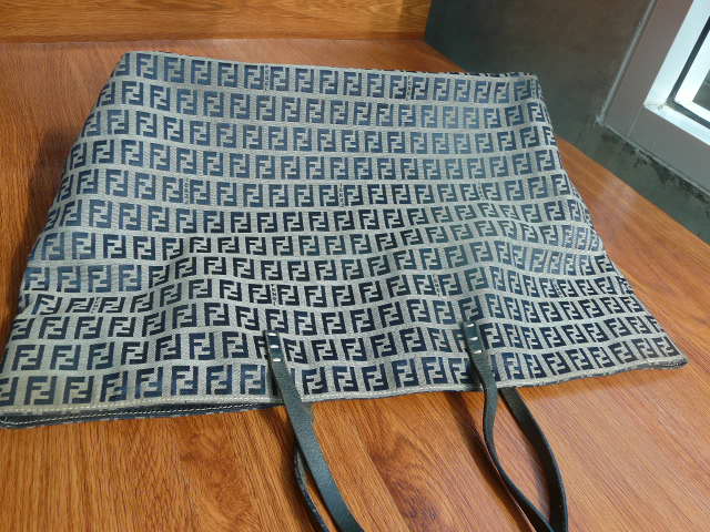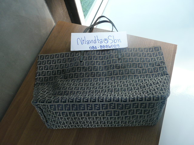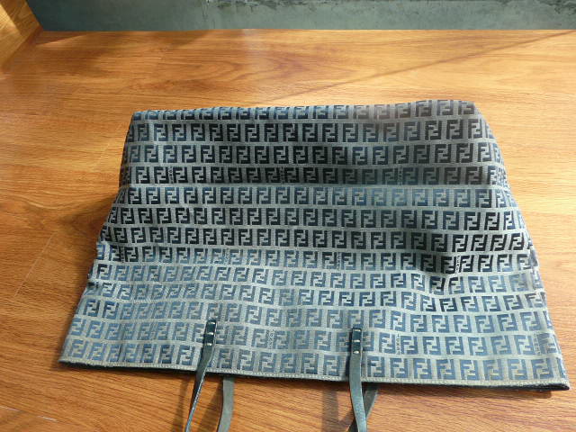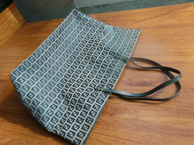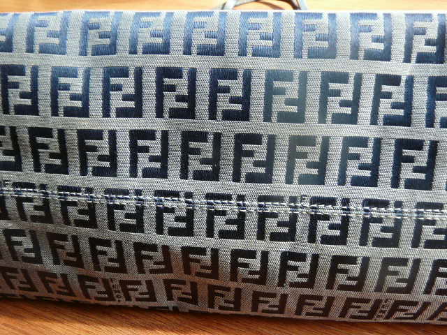 Fendi : กระเป๋า ตัวพื้นเป็นสีเทา ตัวหนังสือ F เป็นสีน้ำเงินเข้ม ซับในเป็นสีน้ำเงิน