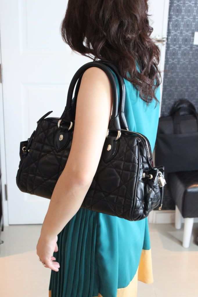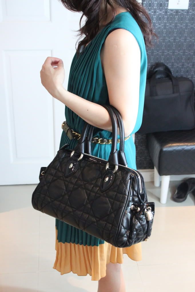 Dior Bag in black lambskin, Cannage Stitching and patent details.