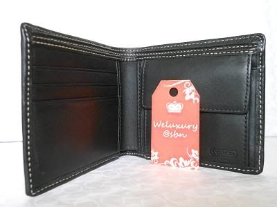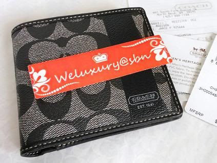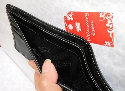 9. Coach Men Heritage Stripe Double Coin Wallet #F74084 กระเป๋า สตางค์ผู้ชาย ลาย signature สีดำ คาดแถบสีดำ มี 3 ช่องใส่บัตรเครดิต / มี 2 ช่องแอบด้านหลังช่องใส่บัตรเครดิต และด้านหลังช่องใส่เหรียญ (ด้านละ 1 ช่อง) / 2 ช่องใส่แบงค์ตามยาว ขนาด: 4.25"L x 3.75" W ราคา 4,500 บาท