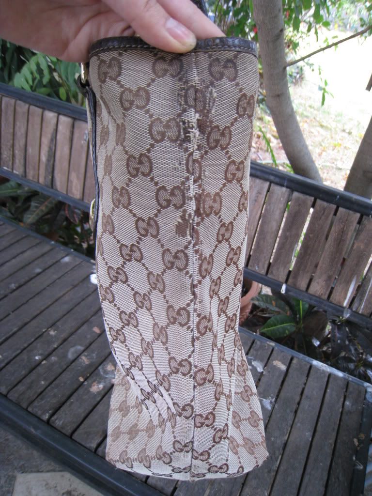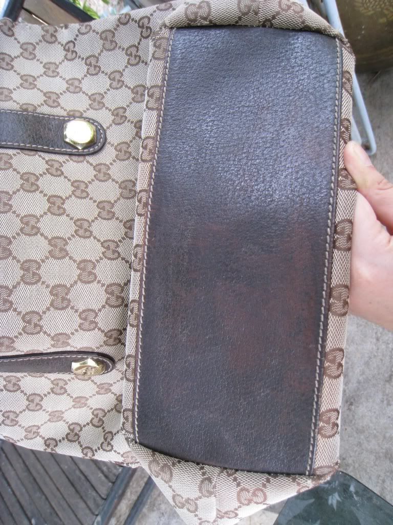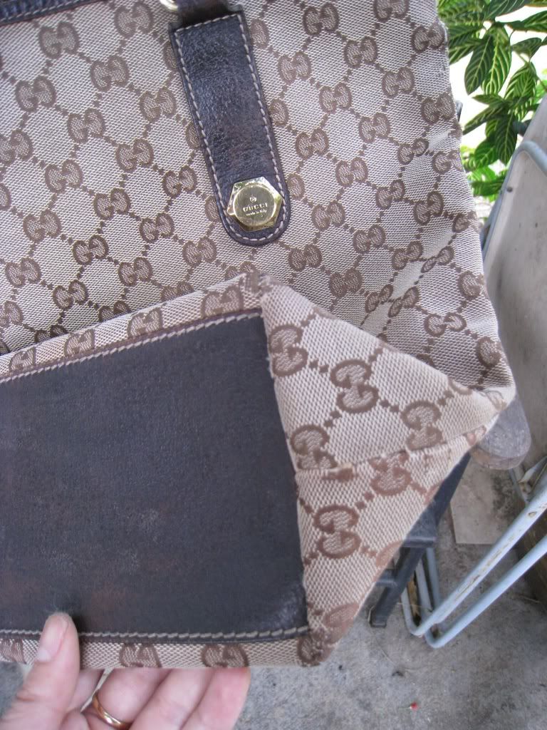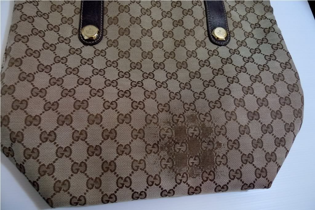 ตำหนิ ที่ฐานกระเป๋าด้านนอก ลาย Logo ซีดจาง เนื่องจากใช้น้ำยาผิดประเภท เช็ดทำความสะอาด