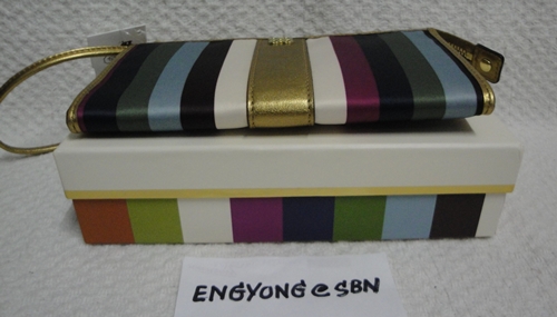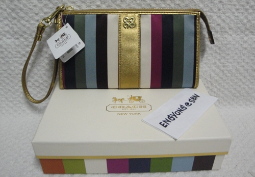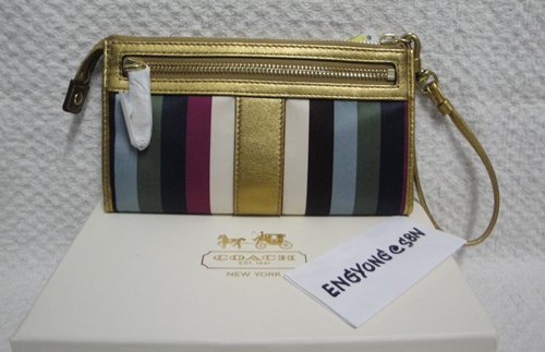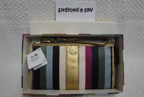 4. COACH - 46807 Julia Legacy Stripe Zippy Wristlet ขนาด 8*4 นิ้ว กระเป๋าคล้องมือรุ่น HISO มีช่องใส่บัตรเครดิต ได้ 8 ใบ มีช่องซิปด้านหลังสำหรับใส่เหรียญ เป็นของใหม่ป้ายห้อยคะ อุปกรณ์มี น้องเป๋า / Care Card และกล่องแข็งลายเดียวกับน้องเป๋า จาก Coach รุ่นนี้เป็นรุ่นที่ไม่มี AC Coach คะ ราคาพิเศษ 3,290 บาท