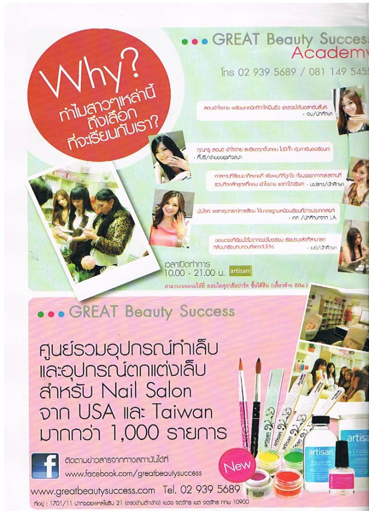 "สถาบันสอนศิลปะทางด้านเล็บที่ทันสมัย และสอนเข้าใจง่ายที่สุด" กับโปรโมชั่น ลด 50% เพียง 1,750 บาทเท่านั้น พร้อมอุปกรณ์ เรียนไม่จำกัดชั่วโมง สอนจนกว่าจะทำได้สวย พร้อมรับใบประกาศจากสถาบัน และยินดีให้คำปรึกษาทางด้านการเปิด Nail Spa จ้า โทร 02 939 5689 / Facebook : http://www.facebook.com/media/set/?set=a.120867971341110.25157.100002537234865&type=3#!/pages/Great-Beauty-Success-Academy/179801358758717 / Website : www.greatbeautysuccess.com