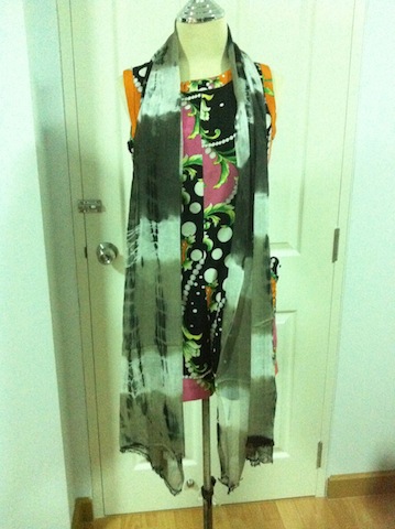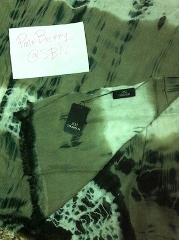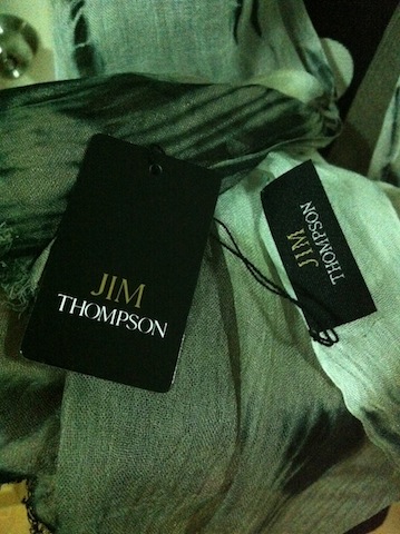 ผ้าพันคอ Jim Thompson ไม่แน่ใจผ้าอะไร แต่น่าจะเป็นไหมแท้อย่างบางคะ เพราะแบนด์นี้ชอบทำจากผ้าไหม