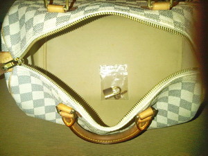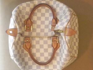 used Speedy Damier Azur 30 สภาพดีมากค่ะ กระเป๋าสะอาดทั้งด้านนอก-ด้านใน (ไม่มีรอยปากกาค่ะ ) ทรงกระเป๋ายังเป็นทรงแข็งไม่ย้วยนะค๊ะ หูจับสีเข้มขึ้นเป็นสีน้ำผึ้งสวยค่ะ ( หูจับสีเหมือนในรูปเลยค่ะ ) อุปกรณ์มีแม่ + ลูกกุญแจ + ถุงกันฝุ่นno-nameค่ะ ** ส่งต่อราคาถูกแล้วนะค๊ะ ** Sold Out Ka **