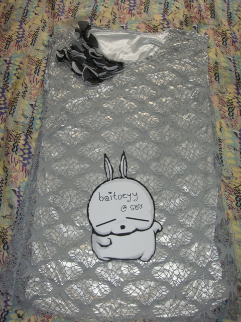 USED ONE TIME++ แซกสีบรอนท์เทา ด้านในเป็นผ้าวิ้งๆสีบรอนเงิน ข้างนอกเป็นผ้าลูกไม้ตาข่ายสีเทา ตกแต่งผ้าเป็นดอกไม้ช่วงคอ ใส่เป็นแซก หรือเสื้อตัวยาว 200 ->>150-