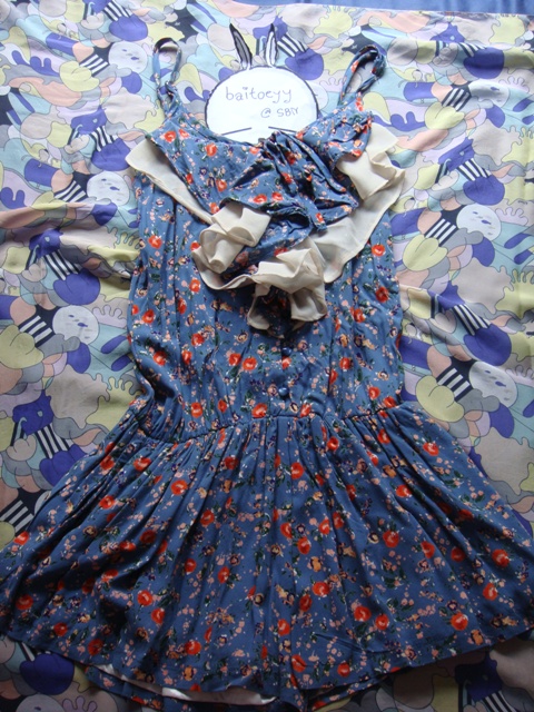 USED Like new/// จั๊มสูท เอวยืด สายเดี่ยว สายปรับได้ สีฟ้ากรมท่า ลายดอก ด้านหน้าตกแต่งระบาย ได้ลุคคุณหนูกันเลยทีเดียว