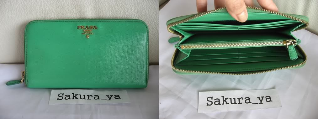 PRADA Saffiano Zip around Wallet Greenสภาพใช้งาน เป๋าไม่มีถลอก มุมสวย โลโก้สีทองซีดลงนิดหน่ิอยคะ ขาย6,500 บาท