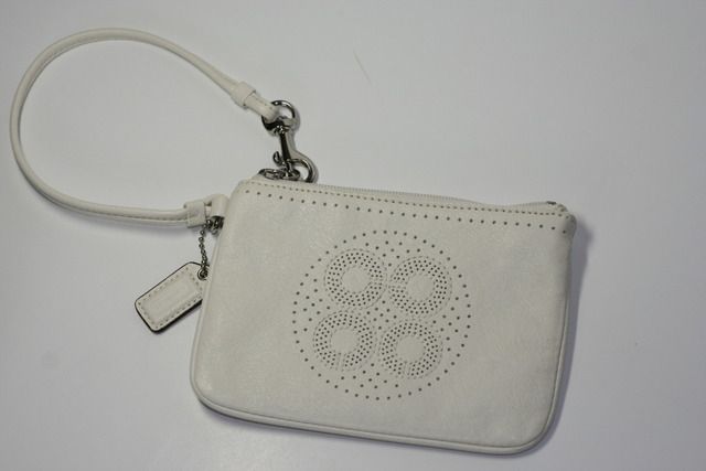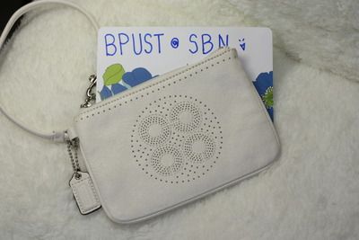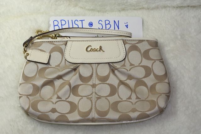 Approx. Size: 7.5"x 4.5"x 1.5" wristlet ใบเล็ก ใส่มือถือ iPhone ได้ แล้วเหลือที่ให้ใส่ของอื่นๆ ด้วยค่ะ กระเป๋าเป็นพื้นสีครีม ลายตัว "C" สีทองเลื่อมๆ สวยมากมายค่ะ (สีจริงตามรูปด้านซ้ายมือค่ะ)
