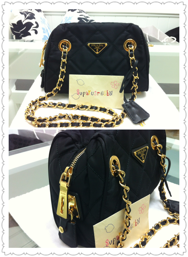 Used Like New Prada Bag สายโซ่ ตัวกระเป๋าเป็นผ้า น่ารักมาก ใบนี้ได้มาจาก shop ที่ไทยคะดูใบเสร็จได้เมื่อ April 2012 ที่ผ่านมานี้เอง : 33000 บาท
